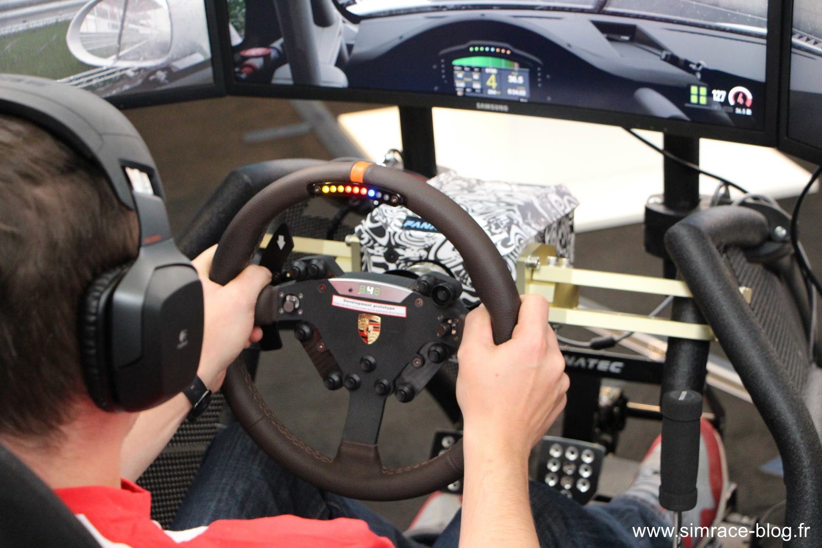 Mais n’oublions pas que c’est un prototype qui a encore besoin de développement. En effet, j’ai assisté au remplacement d’une alim sur un des modèles d’expo qui était tombé en panne, et à plusieurs reprise j’ai vu le volant se mettre à tourner très vite et seul le débranchement de l’alimentation permettait de le stopper. D’ailleurs à ce sujet Fanatec nous faisait signer une décharge avant l’essai pour se désengager des potentielles blessures au doigts et poignets, rassurant ! Il faut donc espérer que cette session de test permette à Fanatec de fiabiliser leur volant. Challenge !