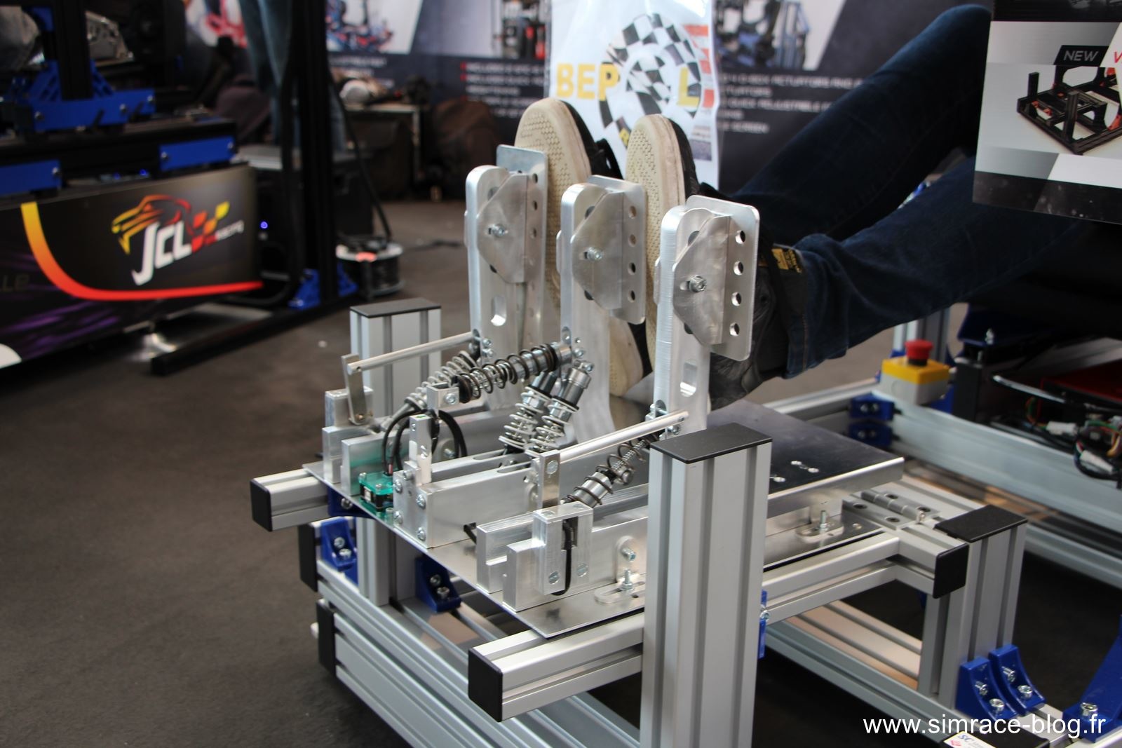 Sur le stand on pouvait aussi trouver différents châssis de la marque, JCL Seat, V2, V4 avec les nouvelles couleurs d’équerres ou encore la nouvelle option pour régler son pédalier en hateur mais aussi nos amis de BEPOL Racing (Freddy et Adam) qui étaient là pour nous présenter leur création, leur pédalier fraîchement dévoilé. Y’a pas à dire, en vrai il impressionne vraiment,c’est sûr que c’est du costaud. On a de l’alu de qualité aéronautique usiné dans la masse, pédale sur roulement à billes et garantie à vie pour la partie mécanique. Au programme potards industriels et Load-cell pouvant allez de 20 à 80 kg de pression. Je n’ai pas eu le loisir de l’essayer en condition réelle car il n’était pas fixé solidement sur un châssis et n’était pas en monté sur un simulateur en fonctionnement dommage mais je pense revenir bientôt dessus.